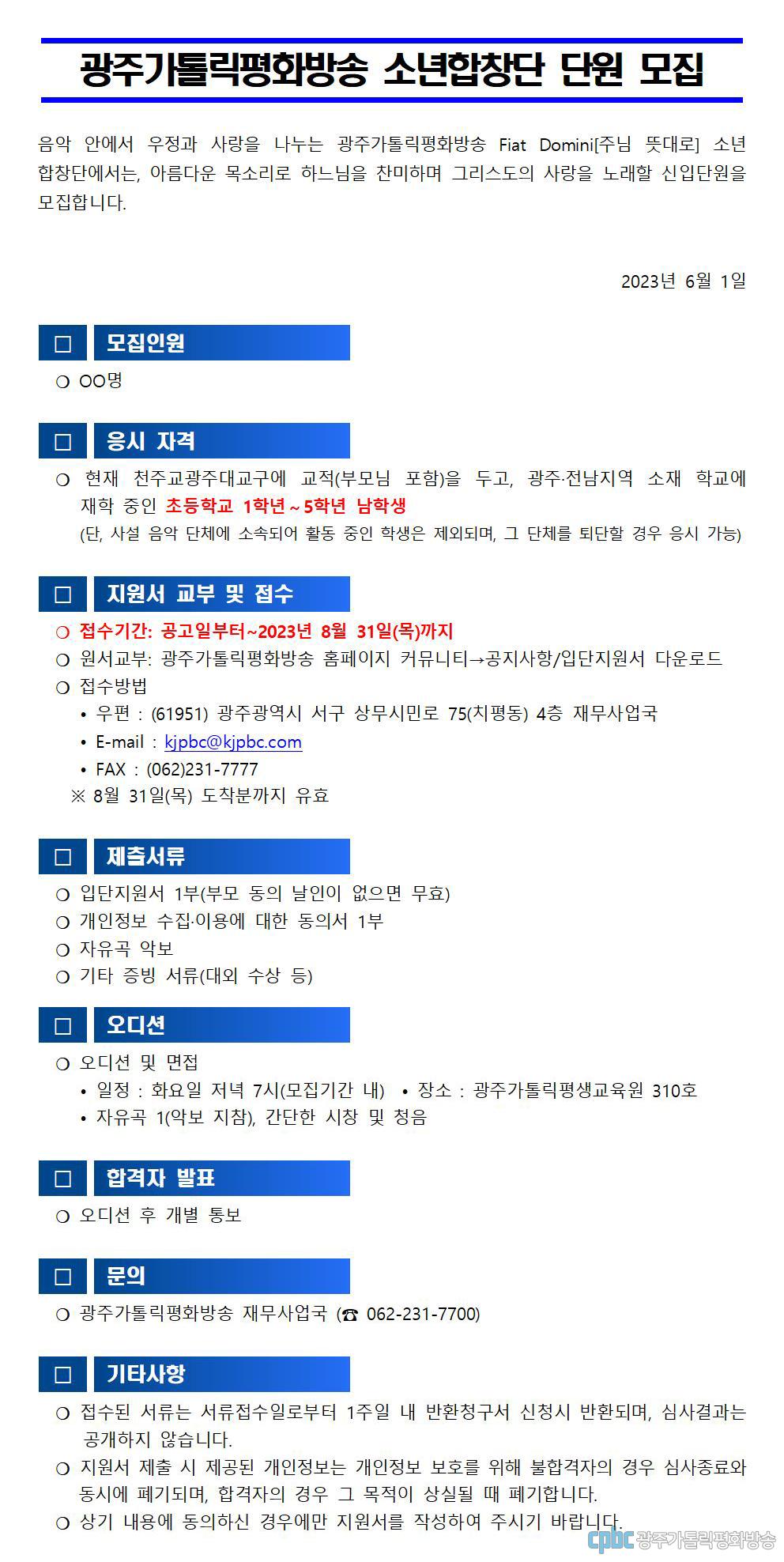 광주가톨릭평화방송 소년합창단 신입단원 모집