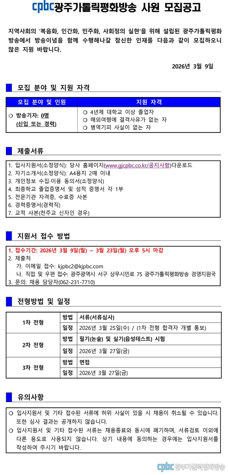 광주가톨릭평화방송 신입사원 모집(채용) 공고