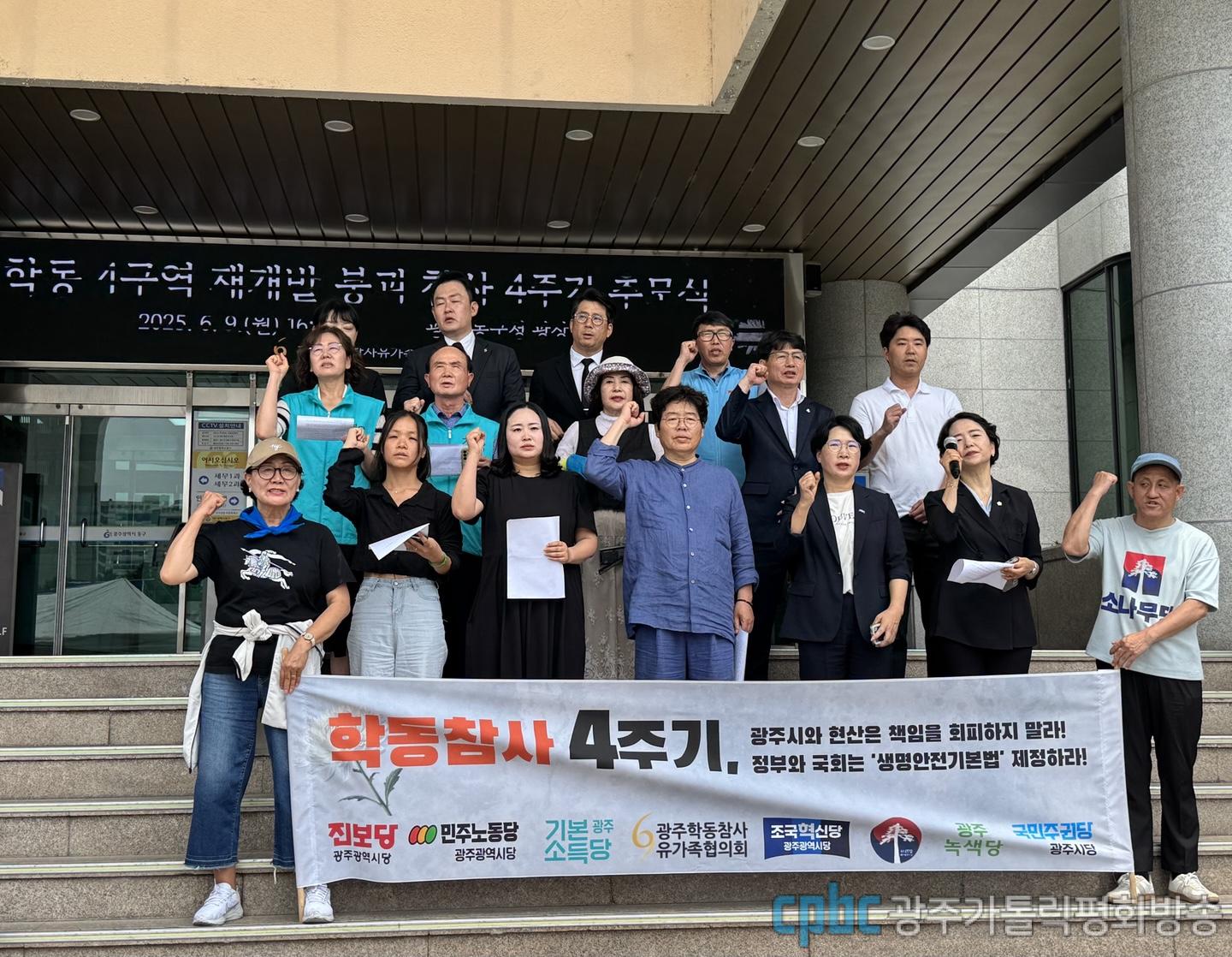 광주 학동참사 4주기인 9일 학동참사유가족협의회와 광주야6당은 광주 동구청 앞에서 기자회견을 열고 광주시와 현산에 참사 책임을 촉구하고 정부를 향해 '생명안전기본법' 제정을 요구했다.